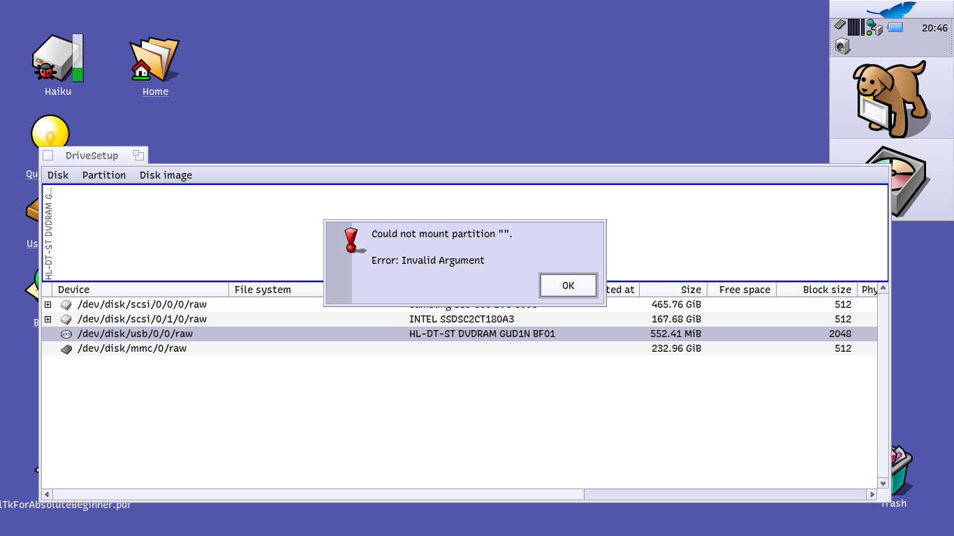 I tried booting Haiku with a USB optical drive with a compact disc already loaded but it seems Haiku can see the drive (at least it shows up in DriveSetup) but not the compact disc itself. I have an internal drive that I can slot in to the Thinkpad’s Ultrabase so this isn’t a major inconvenience.However, it would be great if Haiku could allow USB optical disc drives to be connected in the future.