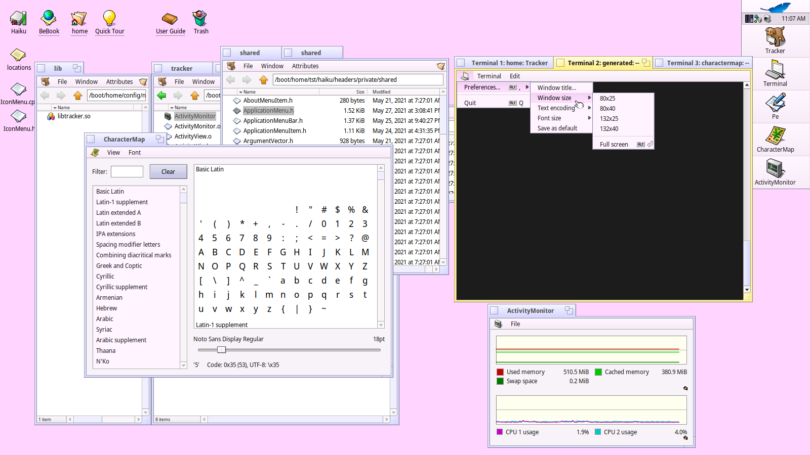 The Terminal example is deliberately made the way it is to emphasize the fact that this all just works as any other menu should, only making it easy for developers to remain consistent with what I feel should be part of the new HIG for Haiku. Developers may wish to keep the quick settings menu on the bar, or to add it as an independent item in the application menu (as I would, personally) separate from the “Preferences” menu item which opens up the preferences window.