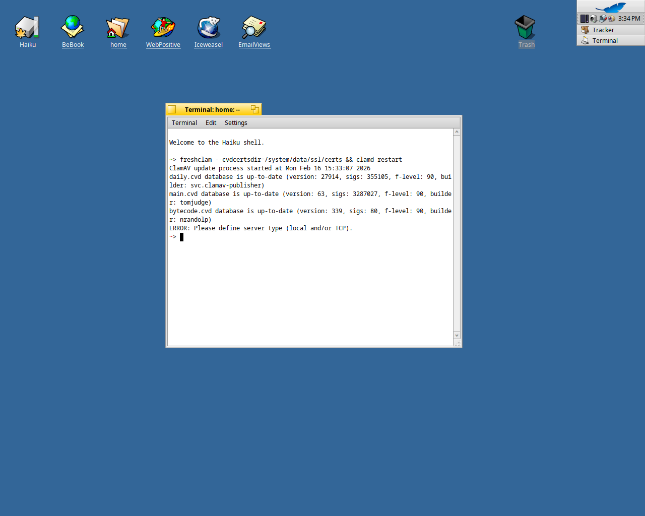 EDIT: for the above error comment out the line with TCPSocket 3310 (in /boot/system/clamav/clamd.conf)