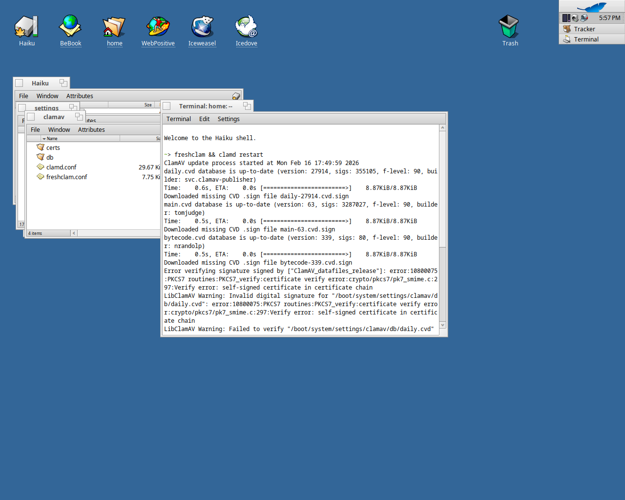 LibClamAV Warning: Invalid digital signature for "/boot/system/settings/clamav/db/daily.cvd": error:10800075:PKCS7 routines:PKCS7_verify:certificate verify error:crypto/pkcs7/pk7_smime.c:297:Verify error: self-signed certificate in certificate chain