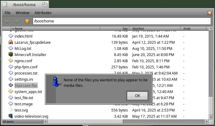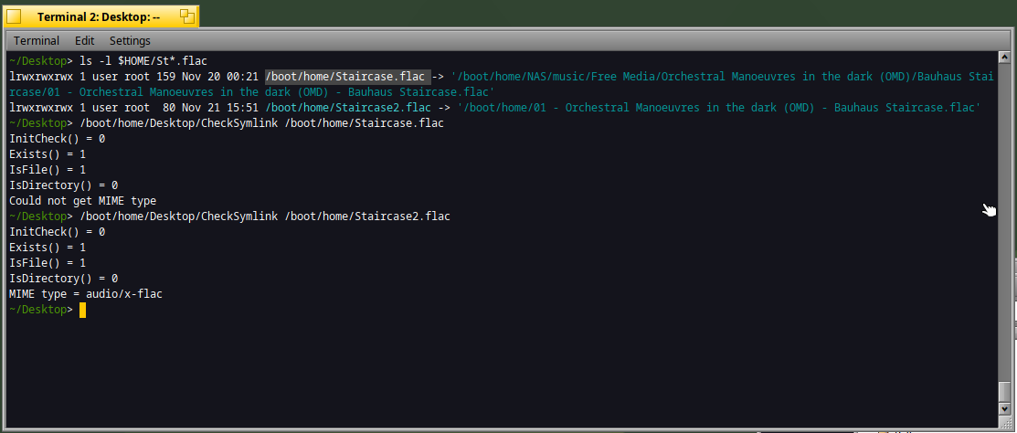 However launching the command below is working fine, meaning the link is valid : MediaPlayer /boot/home/Staircase.flac