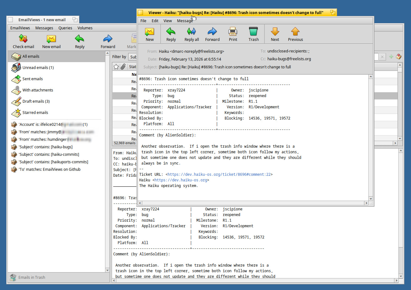 EmailViews is a lightweight native email viewer for Haiku that uses live queries to help users organize and explore their emails effortlessly. EmailViews, which works alongside Haiku’s mail_daemon and Mail Kit, acts as a front end to the email files stored on disk and their attributes, so there is nothing to import or sync. Just run it and you are ready to go.