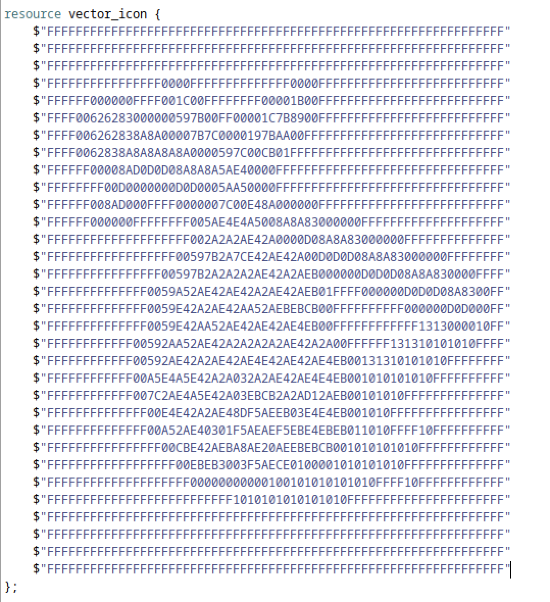 Seems like a representation of the pixel colors with hex values. Possibly a little script with xxd could convert it, or a C program.