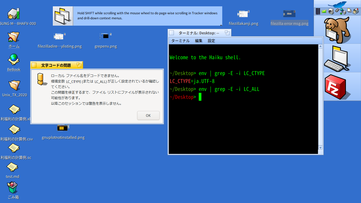 “Character encoding issue: A local filename could not be decoded. Please make sure the LC_CTYPE (or LC_ALL) environment variable is set properly. Unless you fix this problem, files might be missing in the file listings. No further warning will be displayed this session. OK. ”.