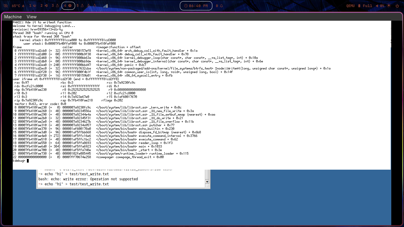 I wrote a new function in inode.cpp ( writeAt ). In kernel_interface.cpp, updated btrfs_write( ) to return this new function instead of B_NOT_SUPPORTED. Also return B_OK when file needs to be shrinked/grow in btrfs_write_stat() function. In Volume.cpp, I noticed the Mount function sets flag to Read only and there is extent allocator crash when mount is finished. For the time being I bypassed these things, just to test if trying to write actually hits the writeAt( ). And it worked. (screenshot attached below)