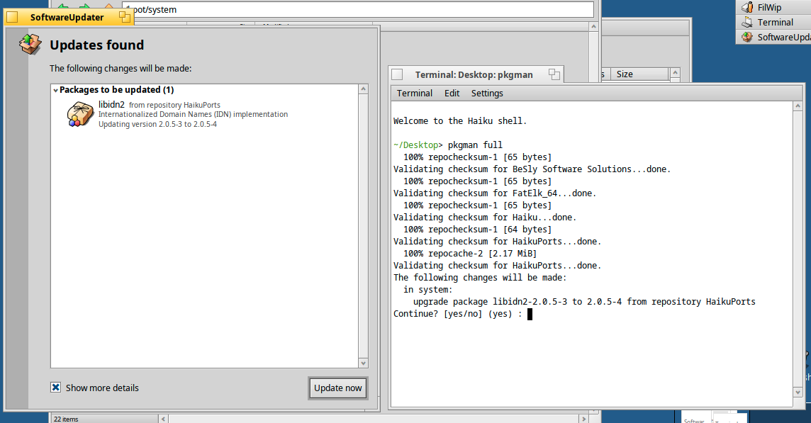 Sorry about the messy desktop photo: I am busy The small screen is 7” touch from my sons Raspberry Pi that Haiku loves and the Silver thing on the right is a 2TB Eaget that is ExFAT that Haiku doesn’t recognize (t was supposed to be cheap, quiet, low power memory expansion). The rest is actual mess!