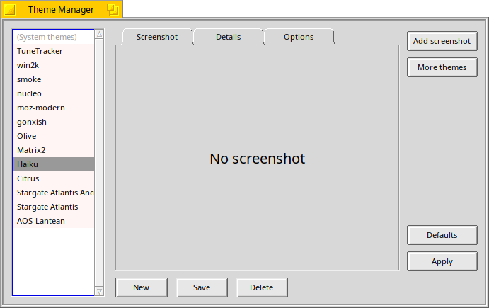 The “More themes” button is supposed to open a window to find themes online. It is really an old app that used to work on BeOS then Zeta and it has capabilities to import BeOS, Zeta and Win9x themes. I can’t remember it working on Haiku.