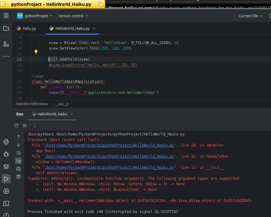 The documentation is mainly the C++ docs and code that has been written with it. For your particular problem, that should be self.AddChild(view, None). I have just added more links to example projects in the Haiku-PyAPI README.