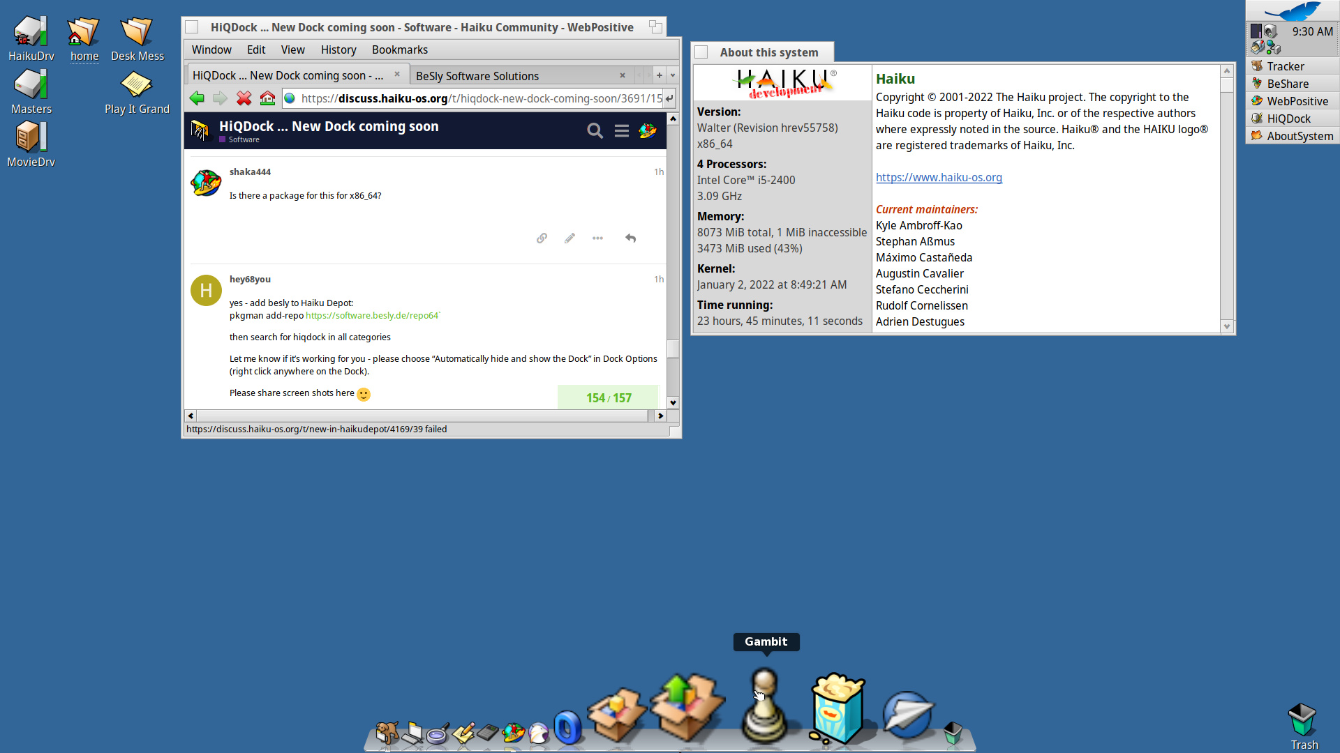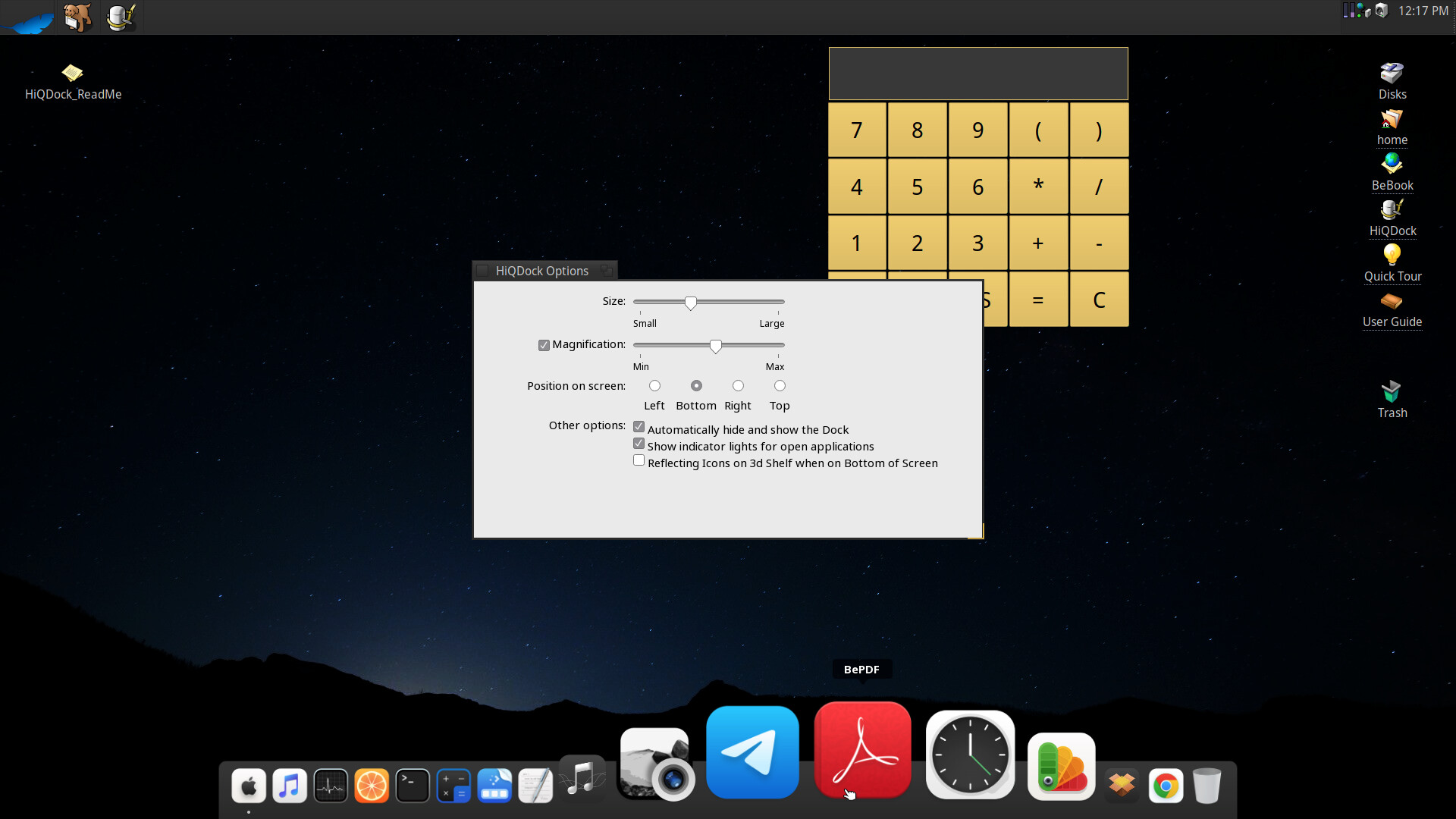 But it you donāt want to use the Dock in auto-hide mode, then because of the fake transparent hack - the dock takes a screen-shot of the whole workspace in auto-start before the Tracker is fully up and running with your desktop background. The only way I know of to get around this is add a wait in UserBootscript to wait until Tracker is launched and then add a line to launch the HiQDock.