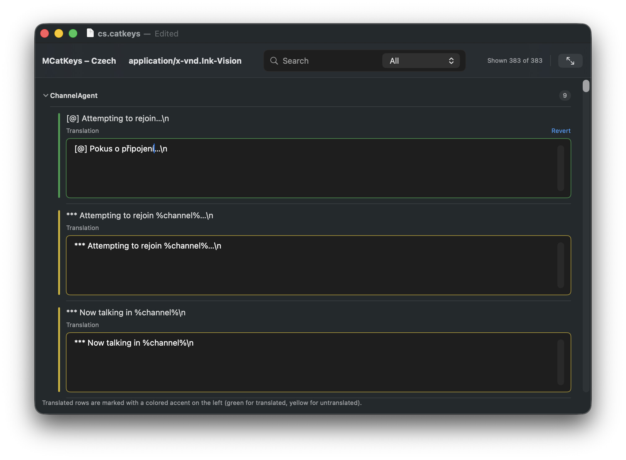 Hello, in my free time Im doing macOS app for local translations. At the moment Its only in development state. It has some basic functionality like Search, switching between Translated/Untranslated and showing number of entries as well as highlighting of translated text, all sorted by Category and Subcategory for easier read