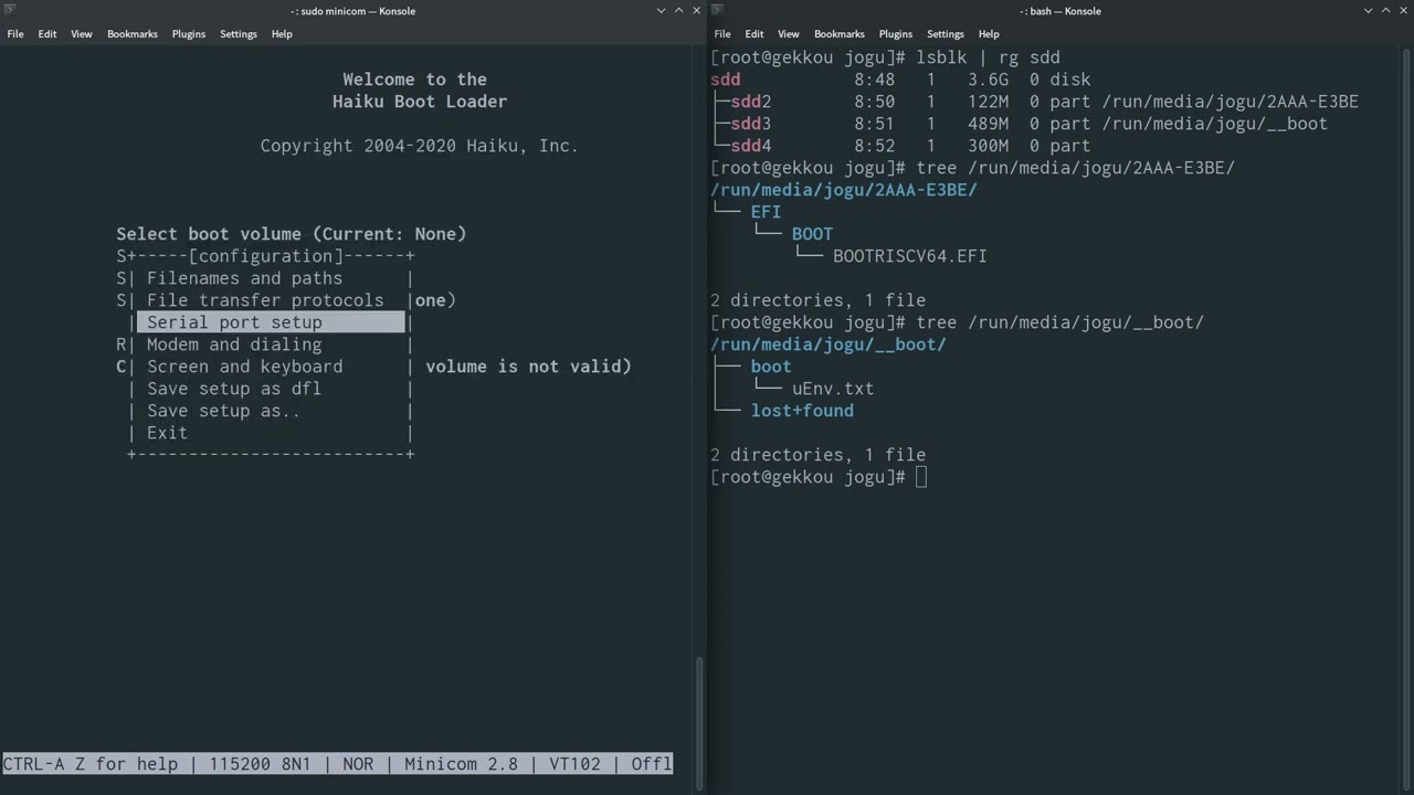 - Partition 2 (VFAT): Contains the EFI/BOOT/BOOTRISCV64.EFI from the Haiku image