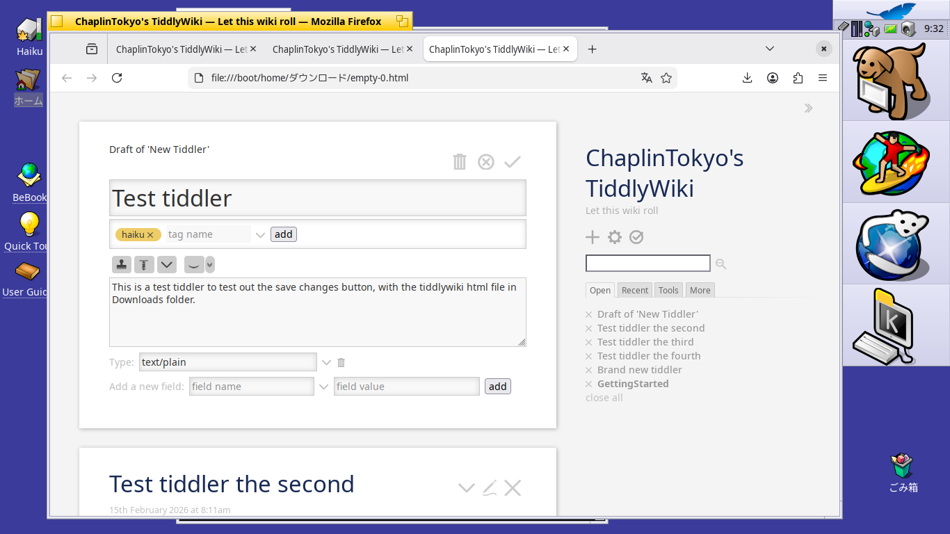 How did you manage to get Haiku to save the changes you made back to disk? On my install, the save changes button did not respond, and ALT+s save would mess up the tiddlywiki coding…