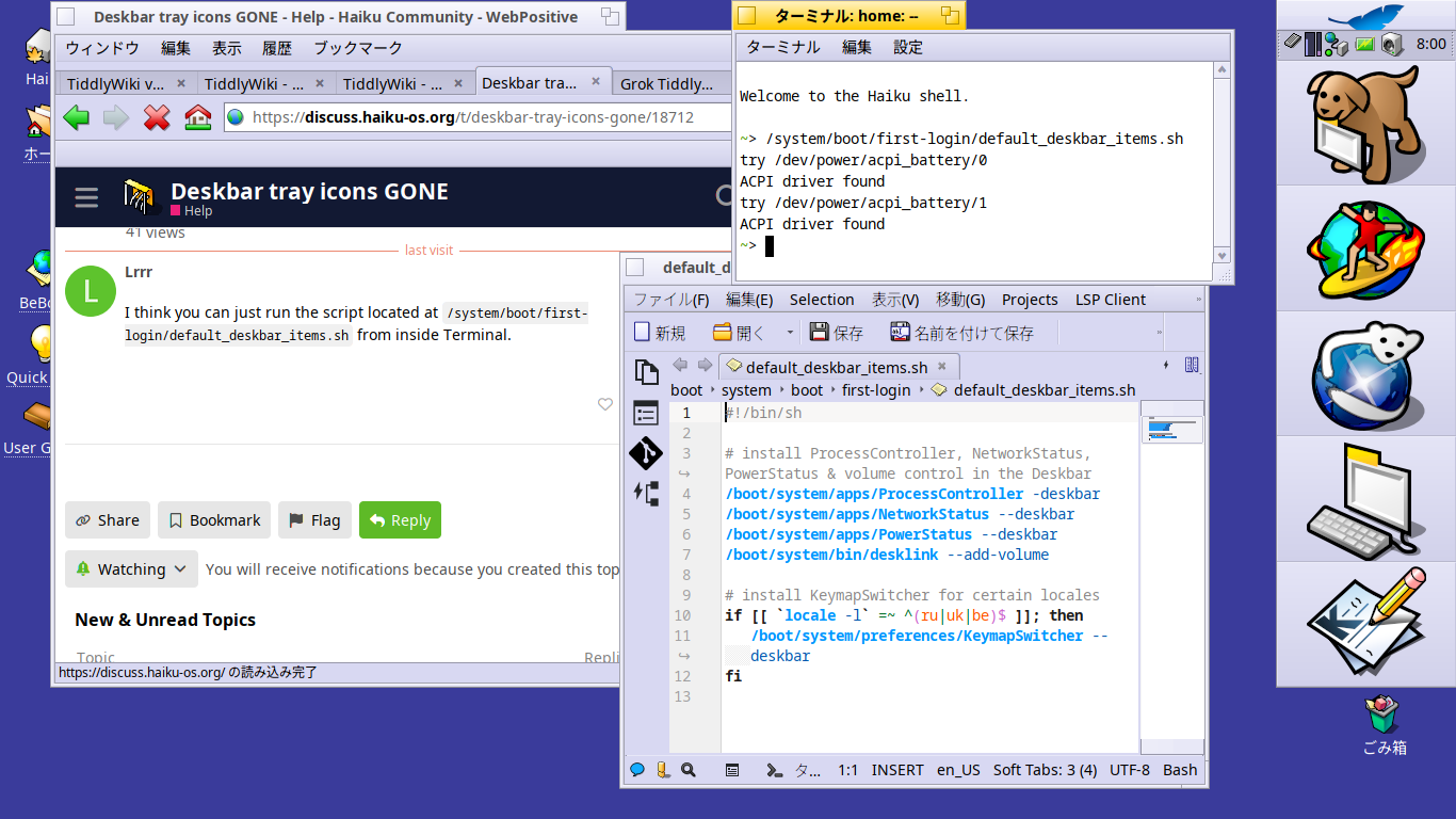 I notice though that apart from the keyboard icon which toggles the Japanese language input method (fcitx+mozc), all my deskbar tray icons have disappeared. Is there any way to get them back, apart from reinstalling from scratch again?
