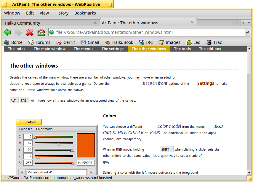 Open the ArtPaint user manual, and click through the pages e.g. with the navigation bar at the top. All is well until you reach “The other windows”. Here the text size is smaller and there’s some space in front of hyperlinks and special styling like menus, keys, etc. Sometimes you’ll have zoom in/out the page in Web+ (ALT+mousewheel).