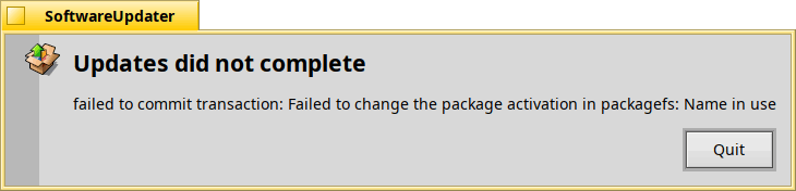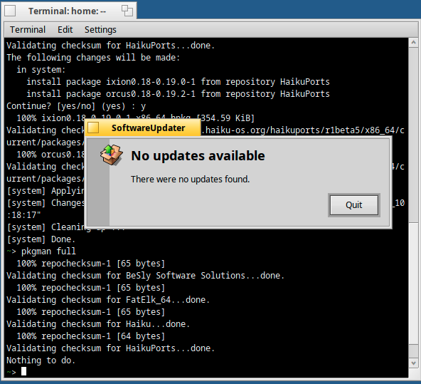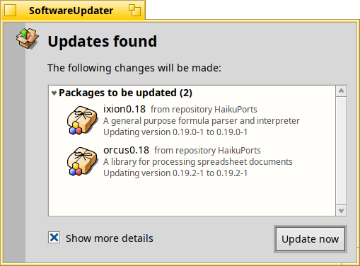 Both of those packages apparently received an update yesterday. Now, invoking pkgman update in Terminal has nothing to update. Running SoftwareUpdater says this however: