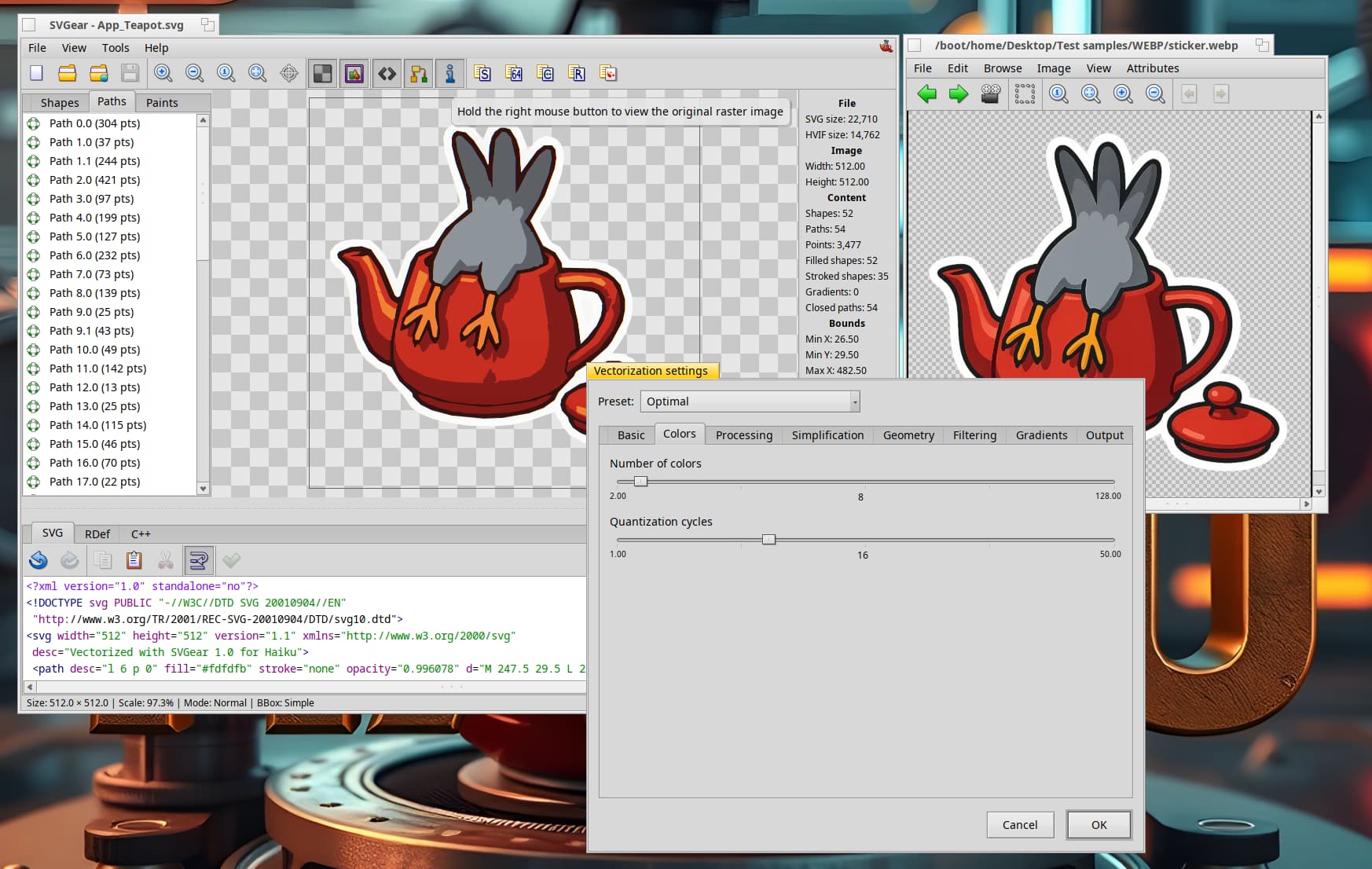 This is probably my favorite feature. You can open a raster image, and SVGear will convert it into a vector! Under the hood, it packs a ton of settings: background removal, gradient detection, path simplification (Visvalingam-Whyatt, Douglas-Peucker), and noise filtering. It’s perfect when you need to quickly turn a logo image into a usable icon.