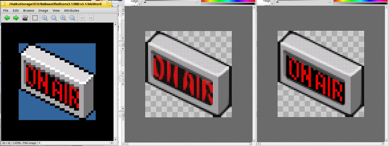 BeOS icons are very low-resolution raster icons, so vectorizing them as is is a very bad idea; we’ll get very poor results. The only thing I can suggest is greatly increasing their size before vectorizing—then we’ll end up with vector images consisting of squares (pixels). But what’s the point?