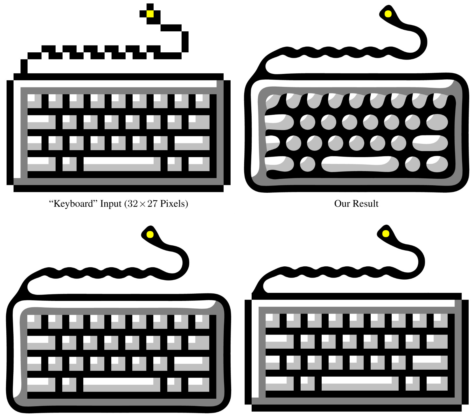 I’m currently experimenting with the Kopf-Lischinsky depixelization algorithm. These are the results on vectorization of pixel art images with very low resolution.