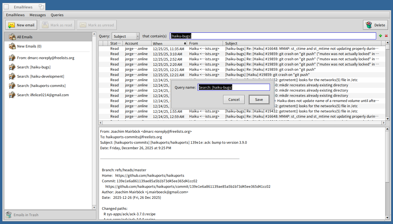 The idea is simple: query-based mailbox views, live updates via node monitoring, tight Tracker integration, and the kind of snappy native feel we all came here for. No reinventing the wheel, just a comfortable reading environment that plays along nicely with the tools that Haiku already provides.