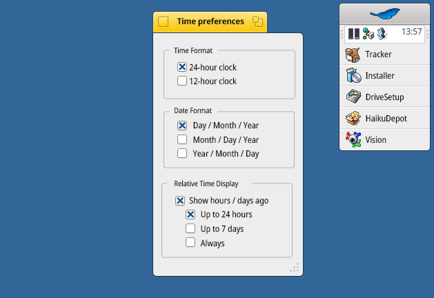 I’m not chasing trends for their own sake. Some of the inspiration came from studying timeless designs like NeXT, BeOS itself, and early macOS systems that valued clarity and directness. I’m also trying to back changes with user-facing benefits: for example, cleaner separation between active and background windows, better contrast in UI elements, or modern conveniences like optional relative timestamps and time format controls.