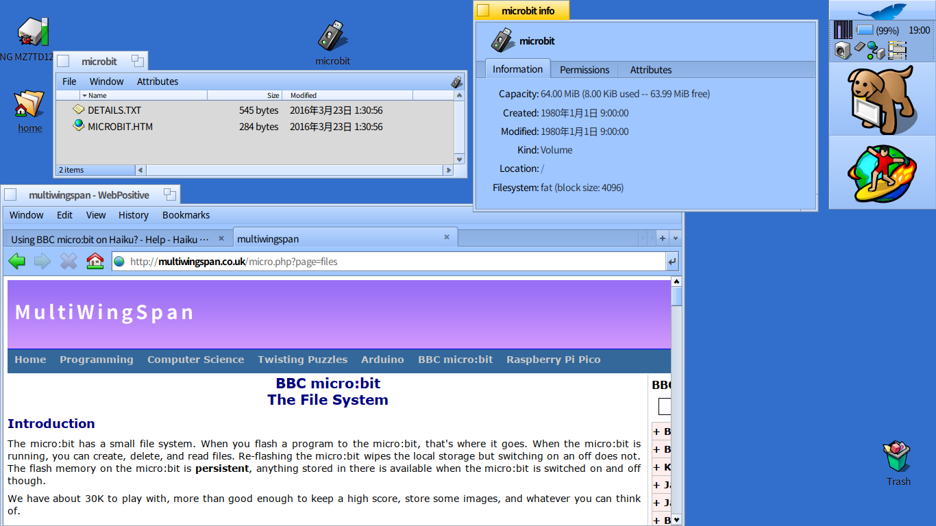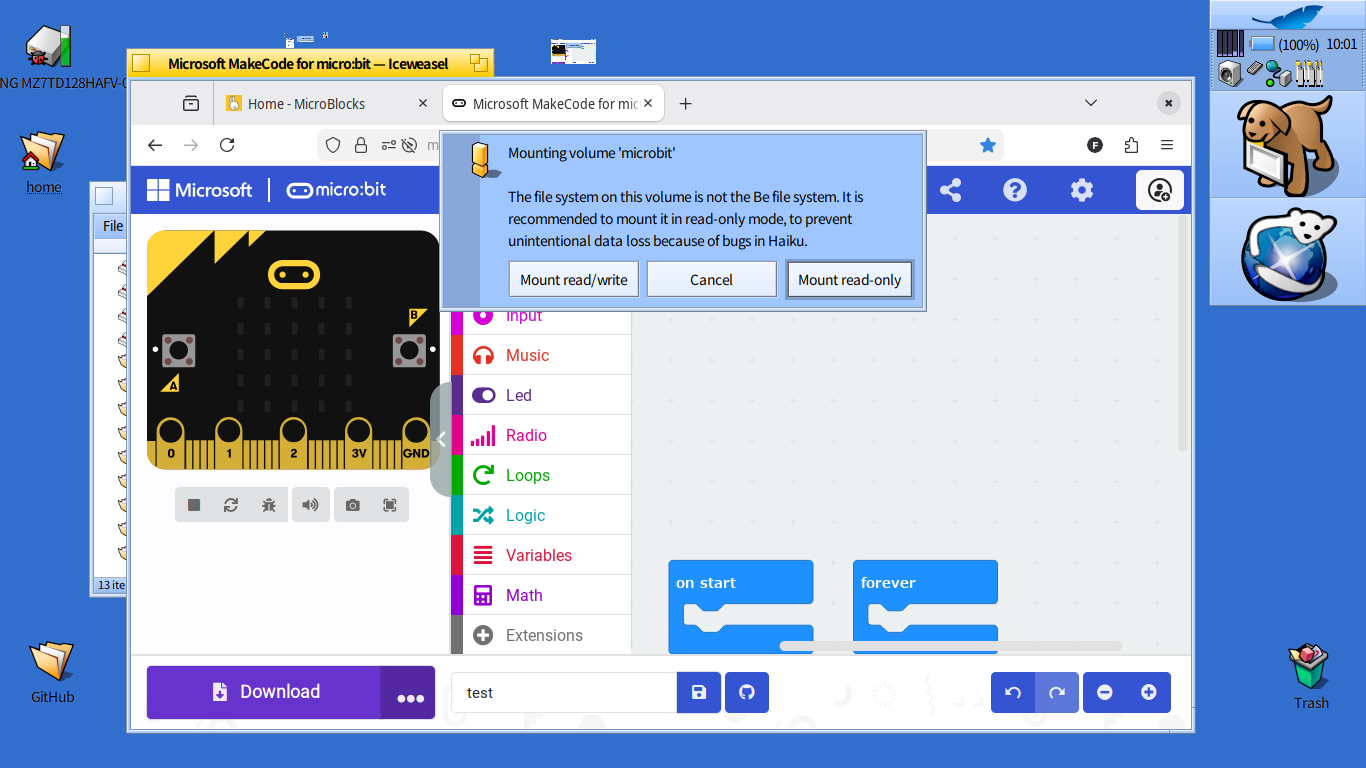 I’m wondering whether it’s safe to play with a BBC micro:bit on Haiku. I plugged it in this morning and got the usual “not a Be file system” recommendation to mount in read-only if possible. Now, with a micro:bit, I’d want to download the programmes from the PC to the board so I really would need to mount read-write.